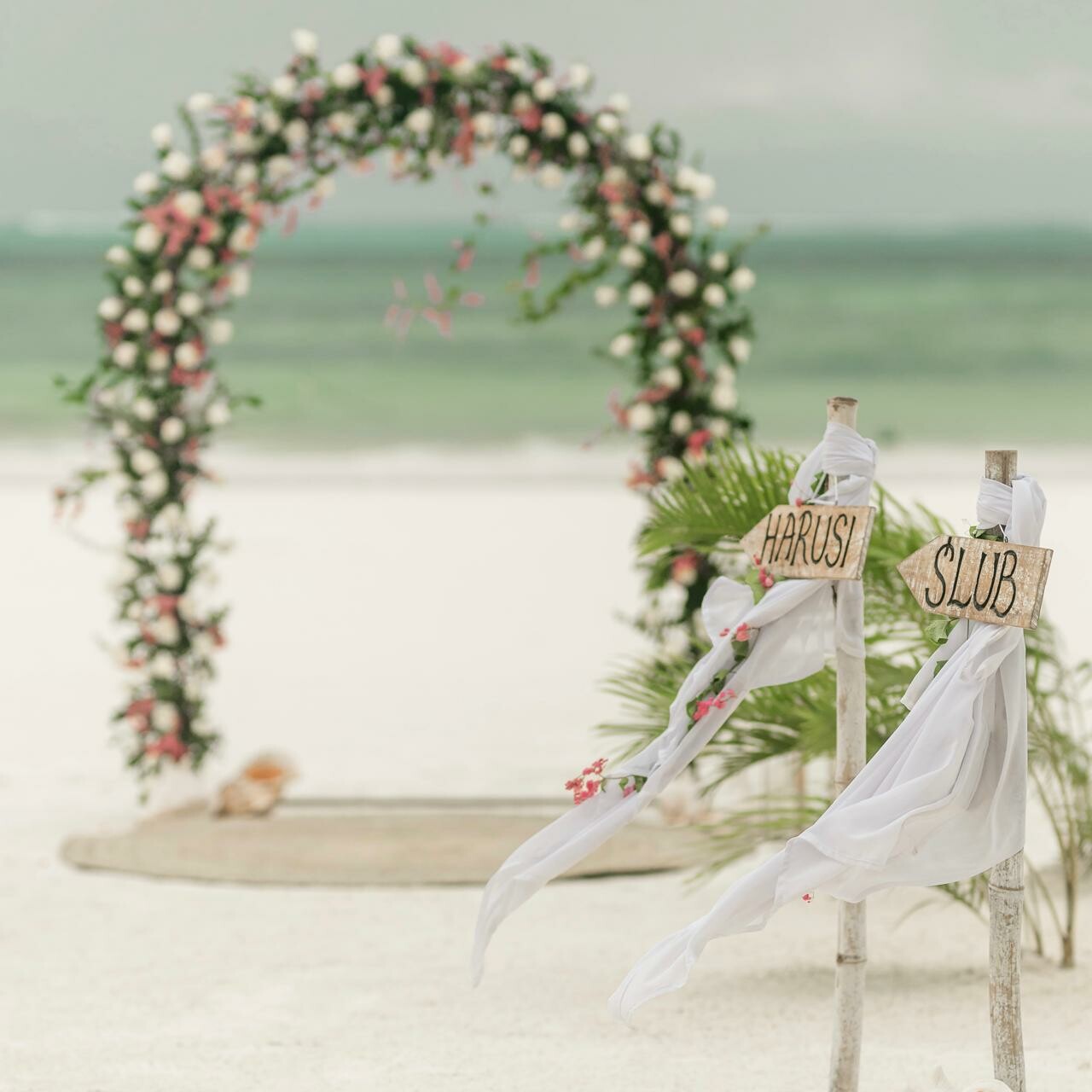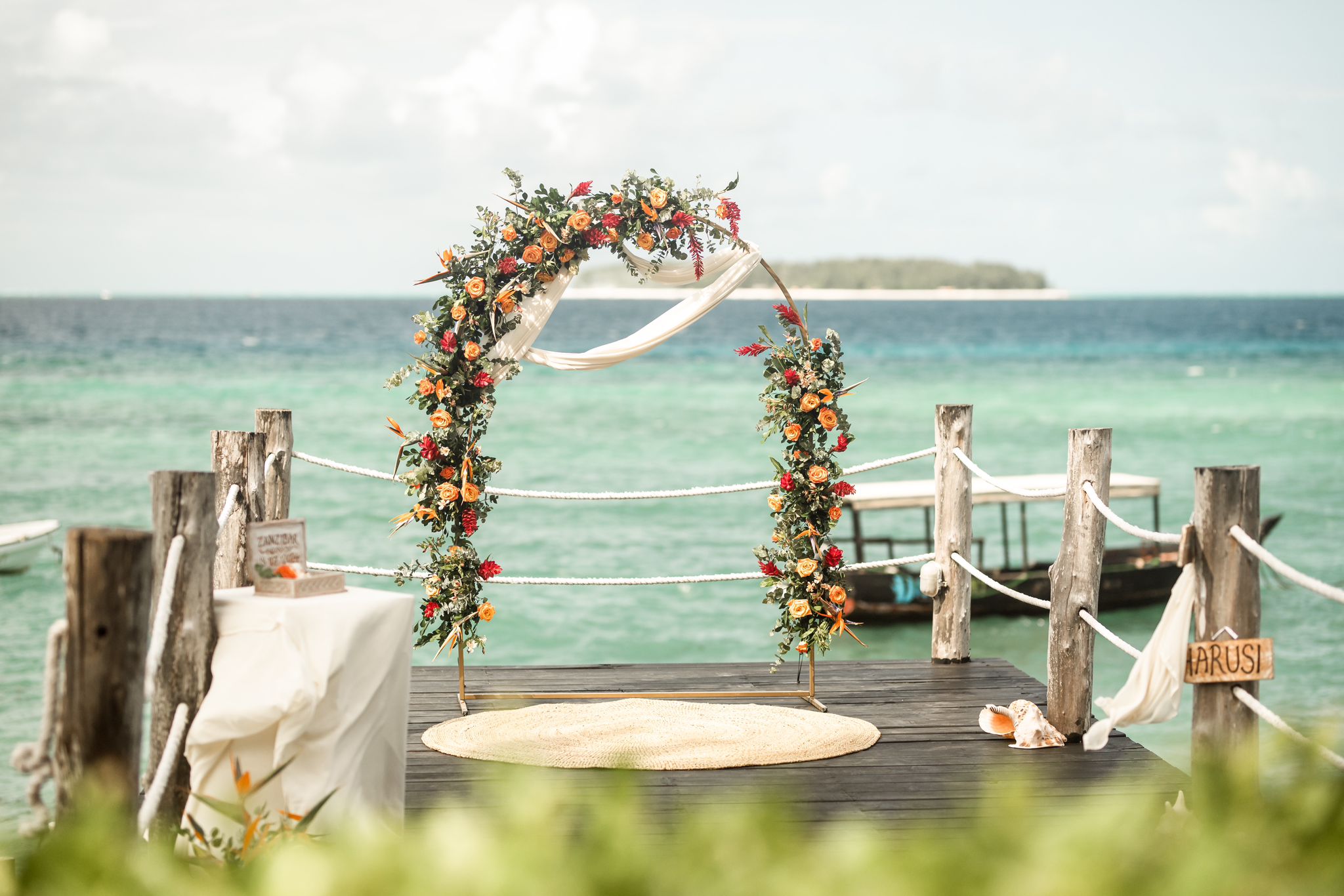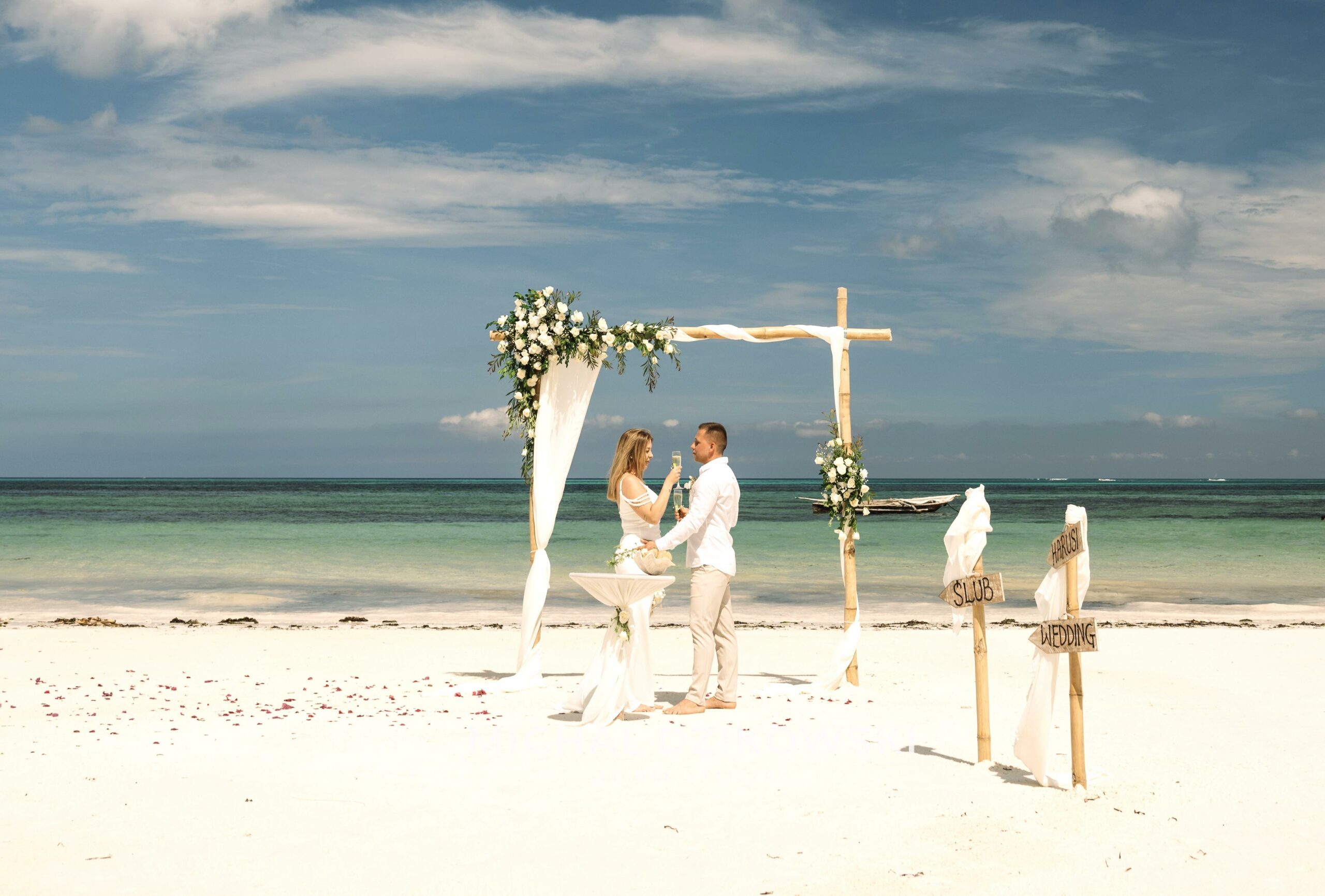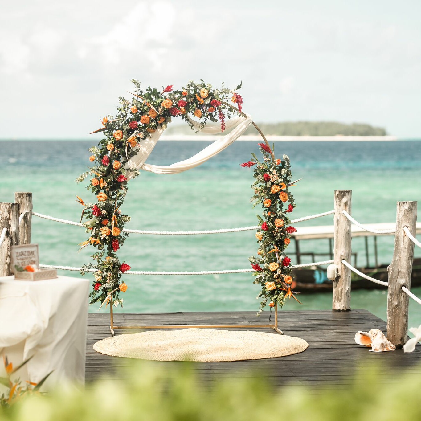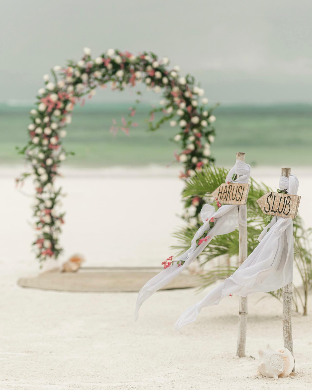 - Decoration of the wedding location: single wedding gazebo adorned with flowers, ceremony table.