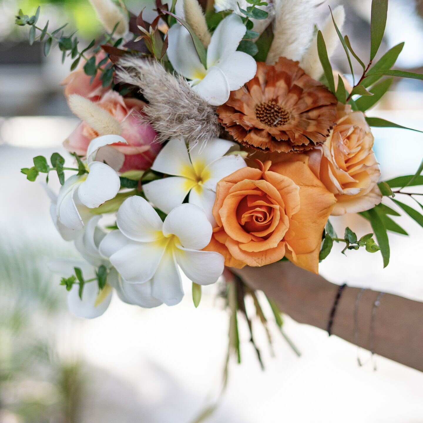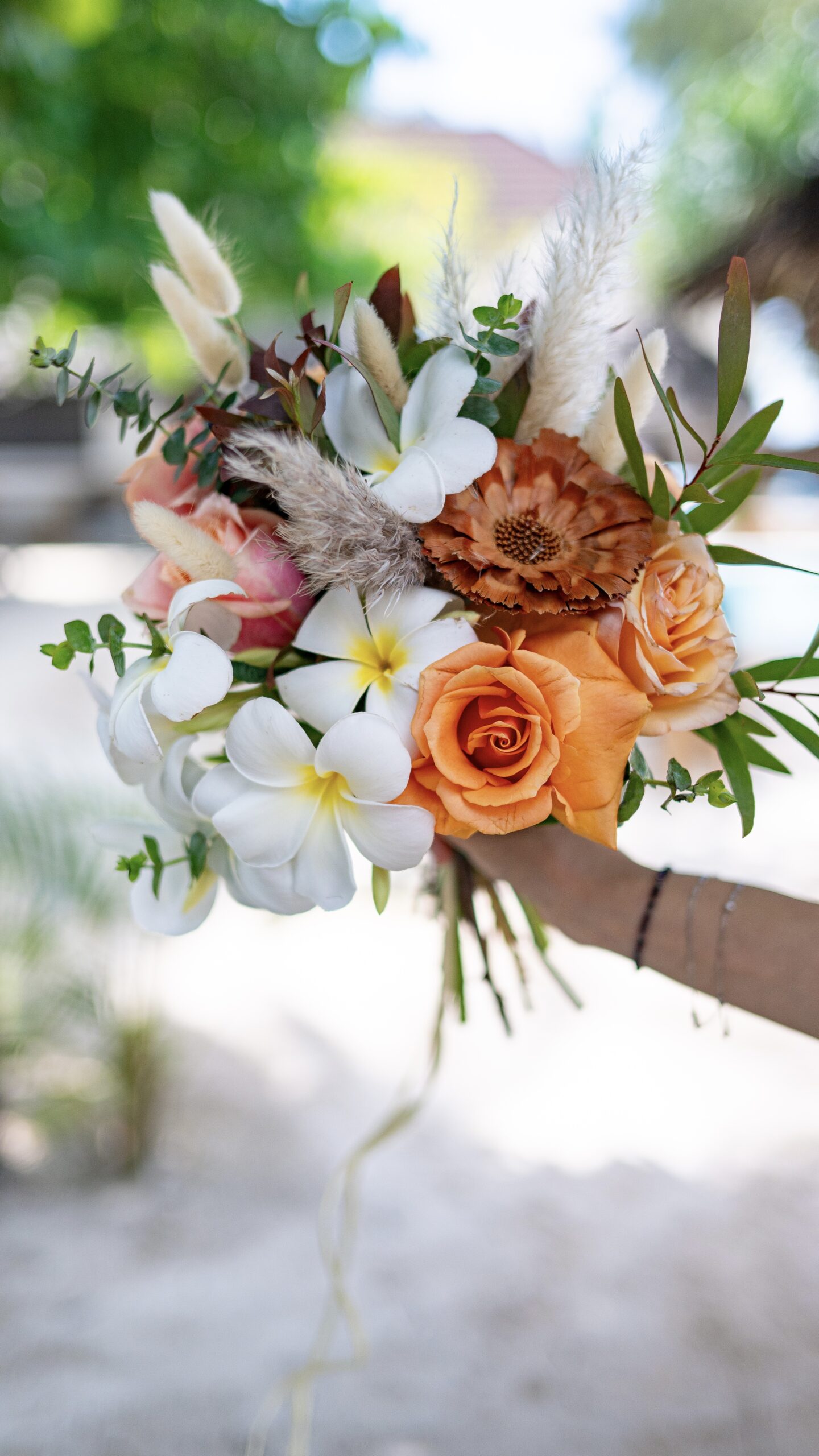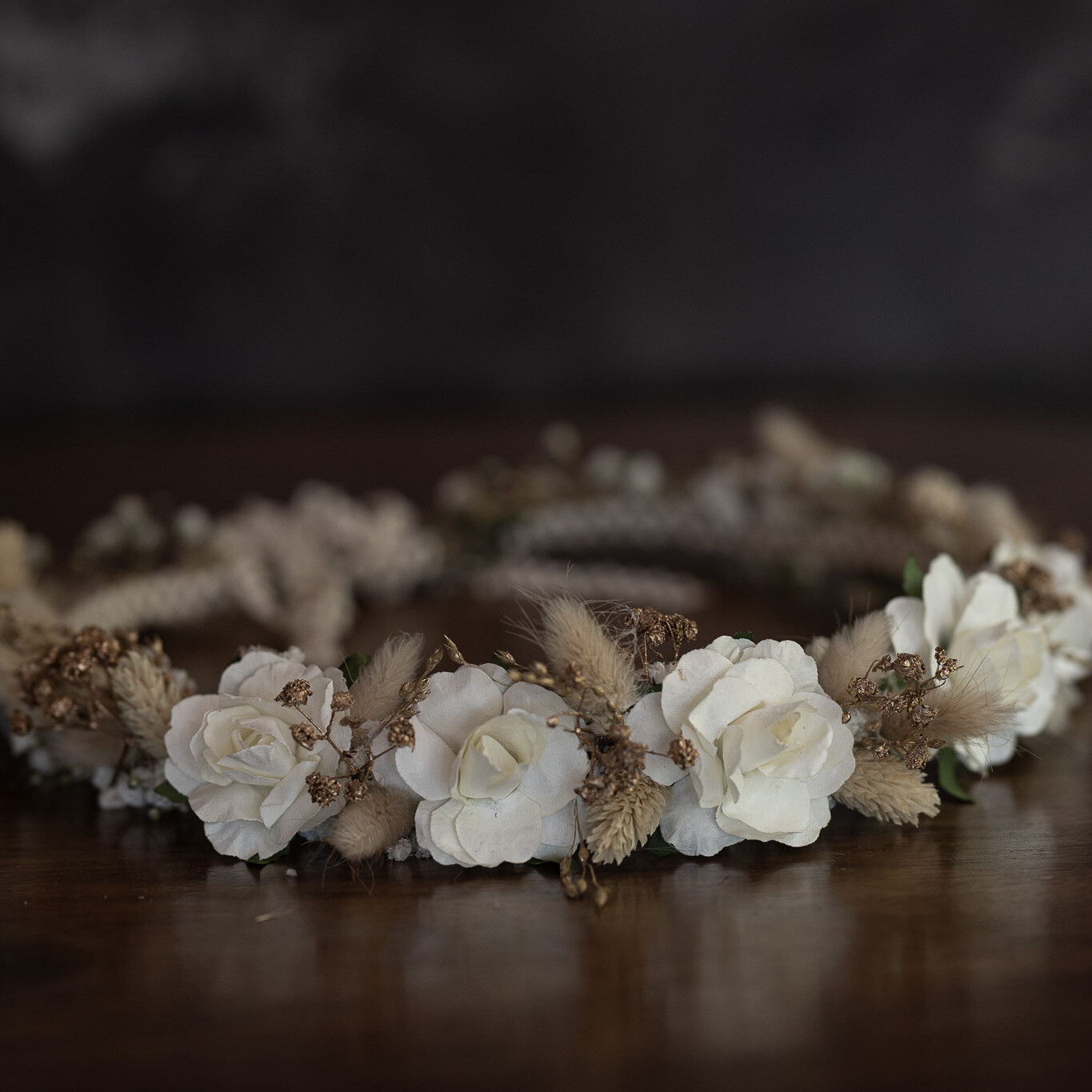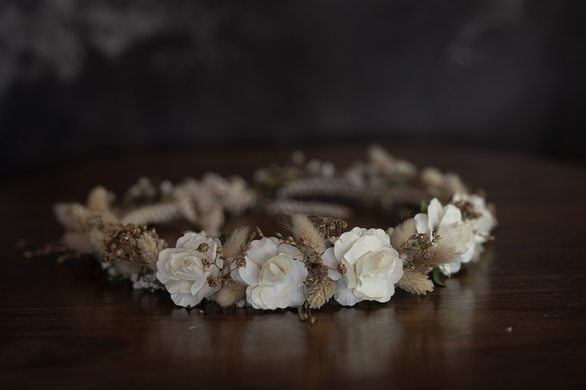 - A bouquet and a flower crown for the bride, and a buttonhole for the groom, made from local flowers.