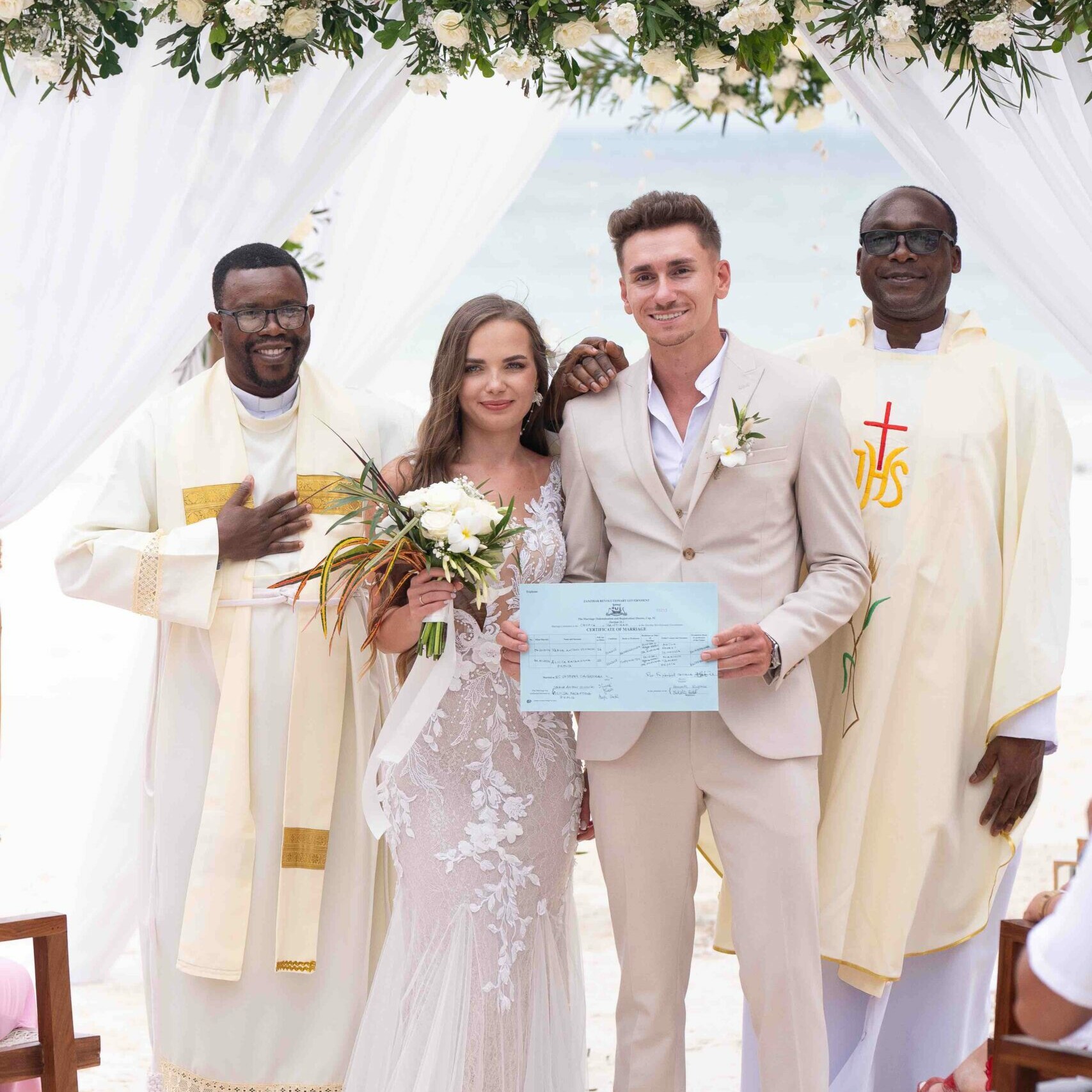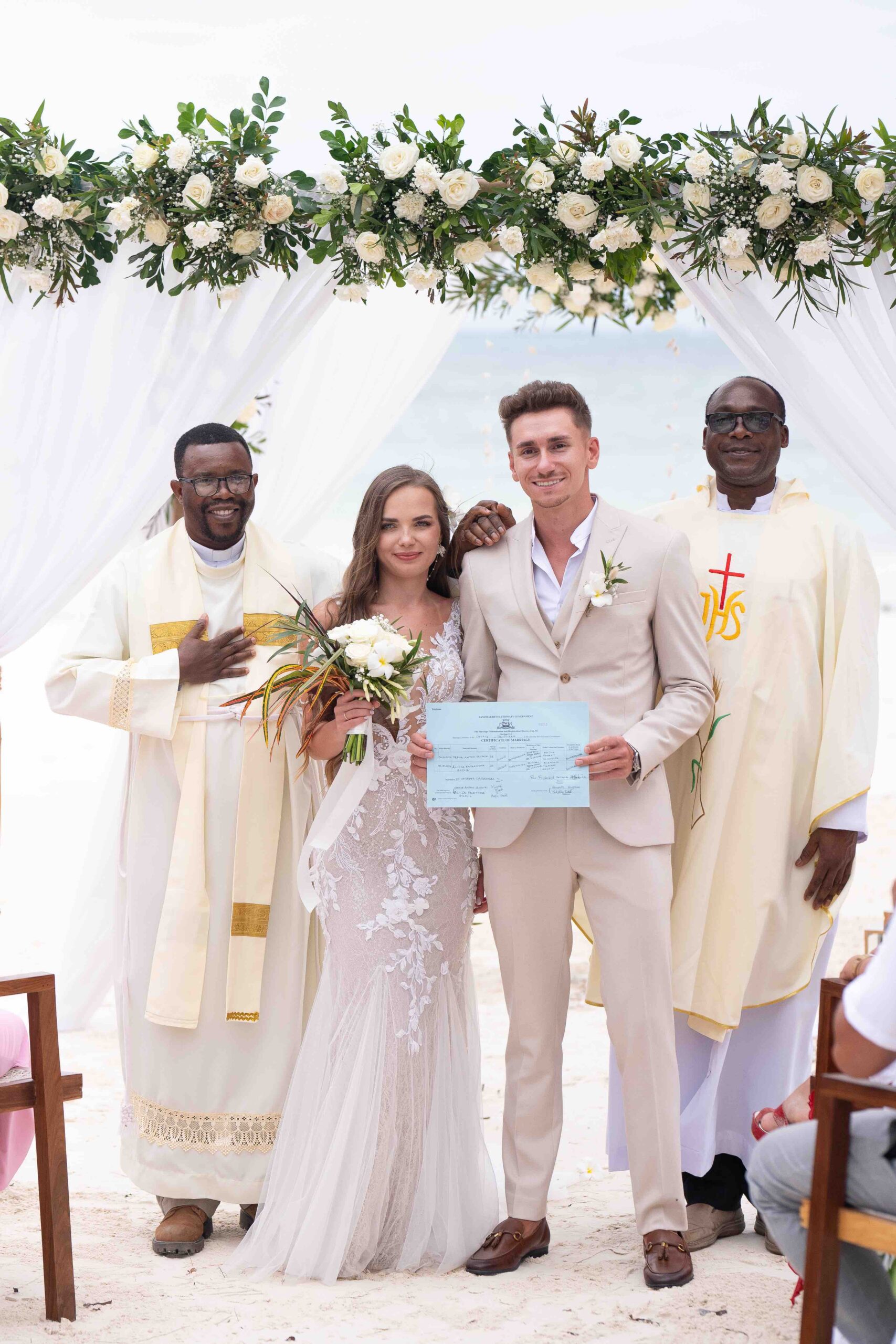 We organize Catholic and Anglican weddings. A priest arrives at the chosen ceremony location and performs marriage ceremony on the beach.