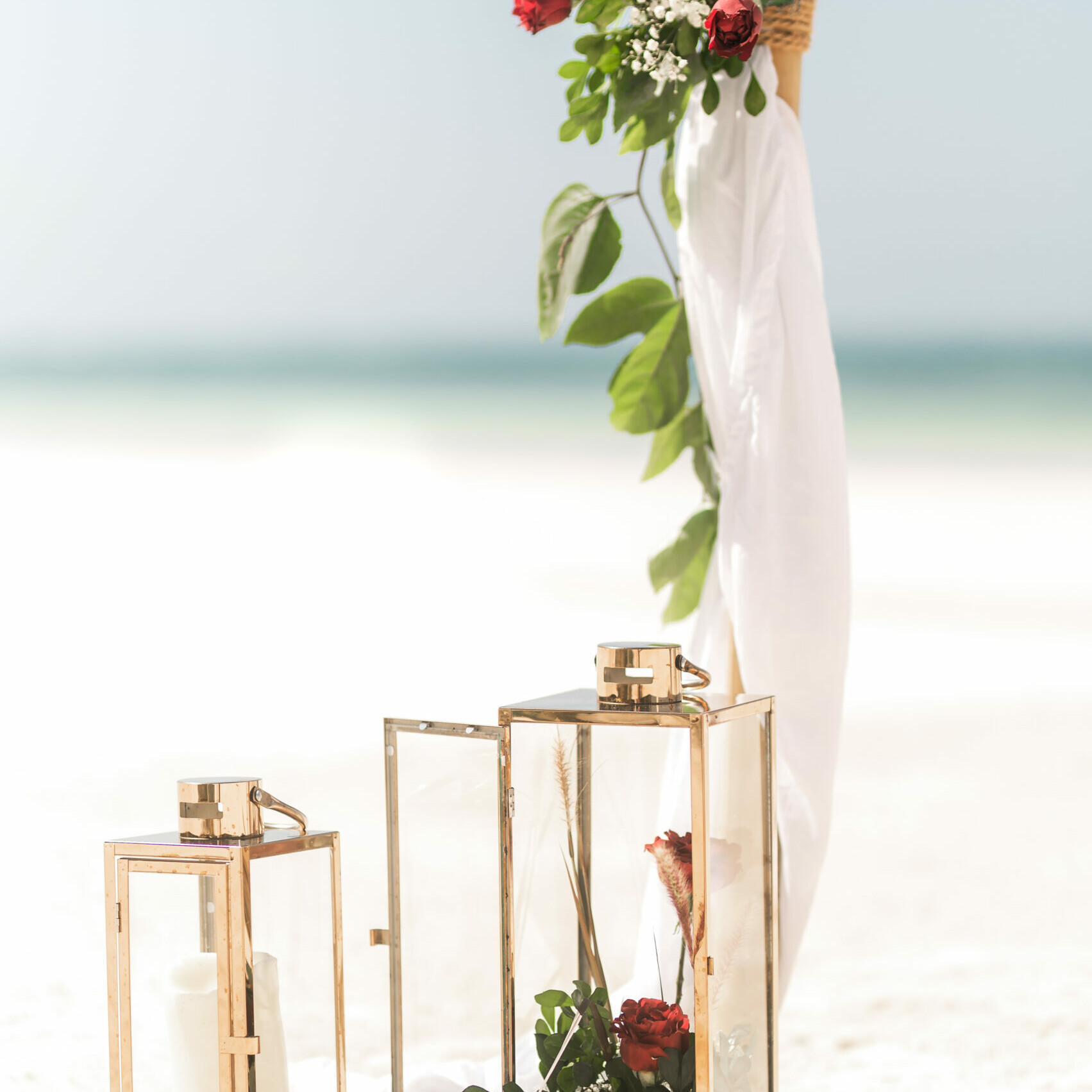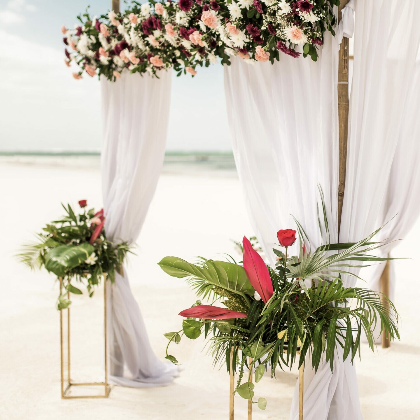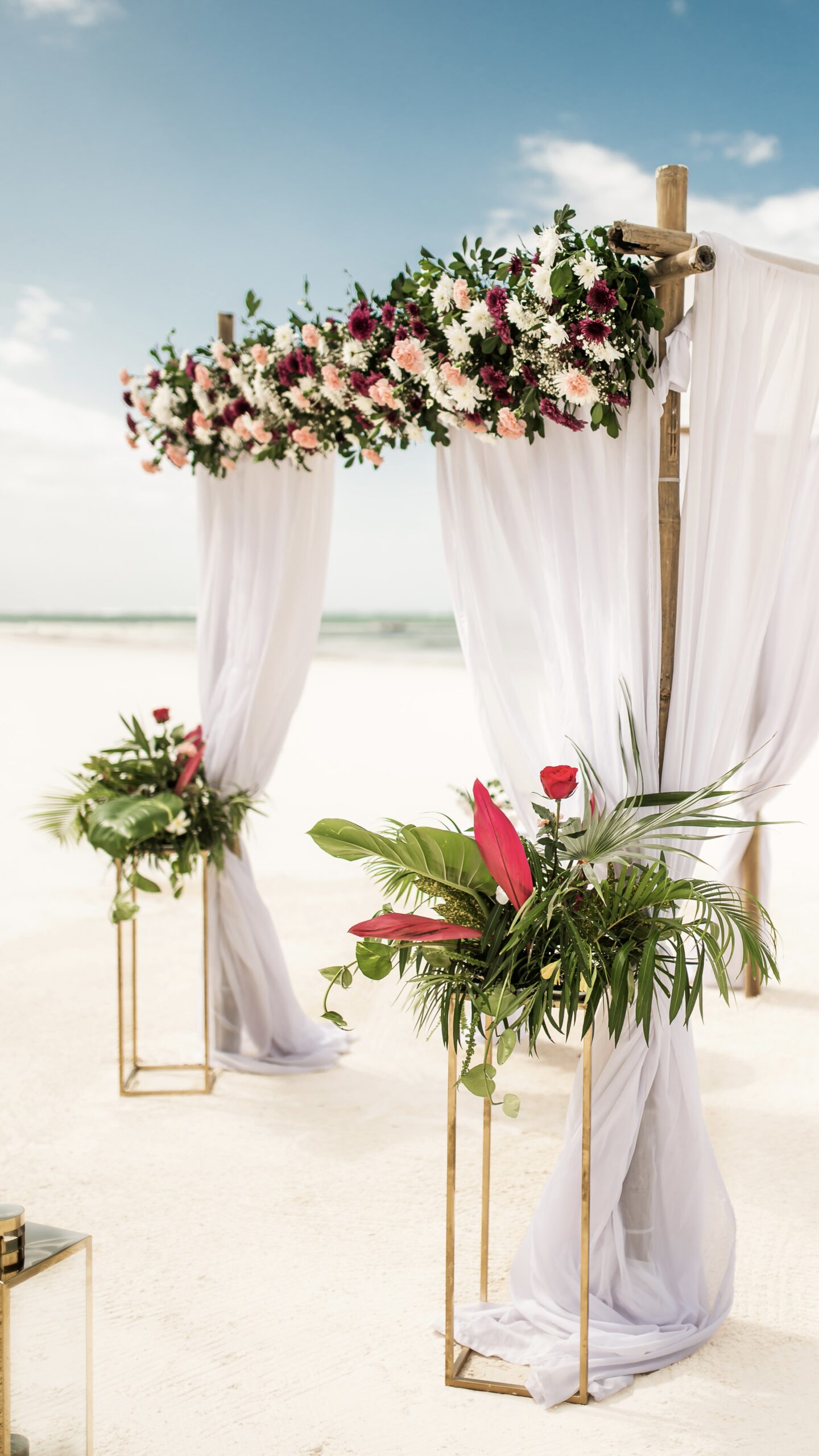 - Decoration of the wedding location: bamboo wedding gazebo adorned with flowers, ceremony table.
