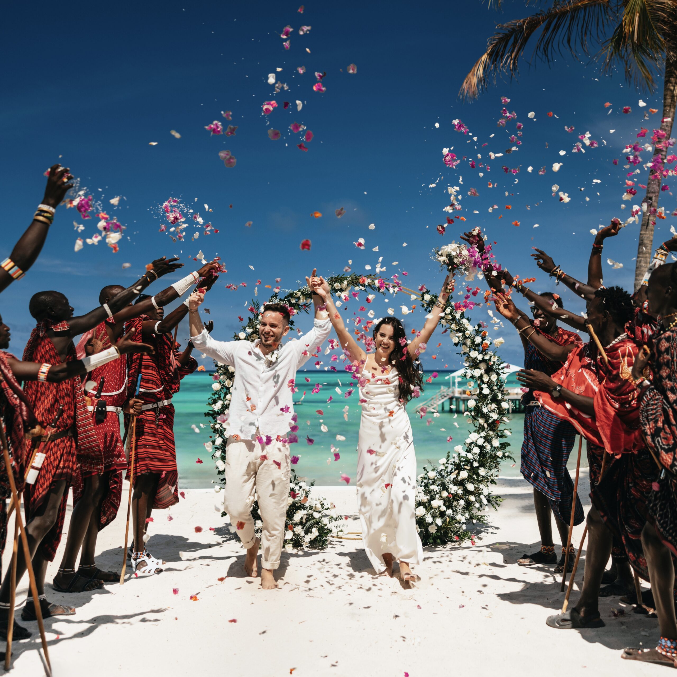 Altanka ślubna na plaży przystrojona girlandami ze świeżych, tropikalnych kwiatów, a do miejsca zaślubin prowadzi Masajski orszak. Ich taniec i niesamowity śpiew na długo pozostanie w Waszej pamięci.
